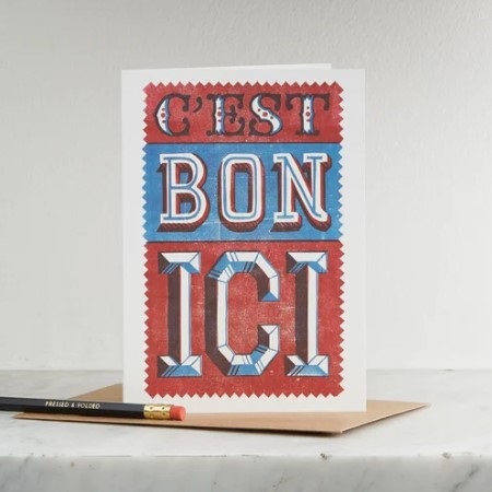 イギリスのカードメーカーPRESSED&FOLDED社の商品から、 もともとシルクスクリーン版画向けに作られたものの ポストカードバージョンを入れてみました。 美しいデザインはいろいろな場面でお使いいただけます。 [PFJB0026] STICK IT TO THE MAN [PFJB0027] C’EST BON ICI ここはいいところだ [PFJB0028] TIE THE KNOT [PFJB0032] DEVIL TAKE THE HINDMOST 早い者勝ち=遅いものは鬼に食われる [PFJB0035] HAIRSTYLES [PFJB0071] MAGIC 魔法が生まれるところ いずれも二つ折りカード。12*17cm。 100%リサイクルの再生封筒が一枚付属し、 生分解性のOPP袋に入っています。 ※ロットは 3 といたします