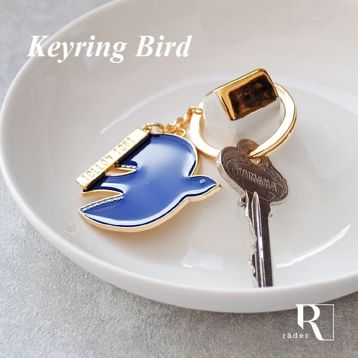 ブルーの鳥のチャームが付いた金属製キーホルダー。